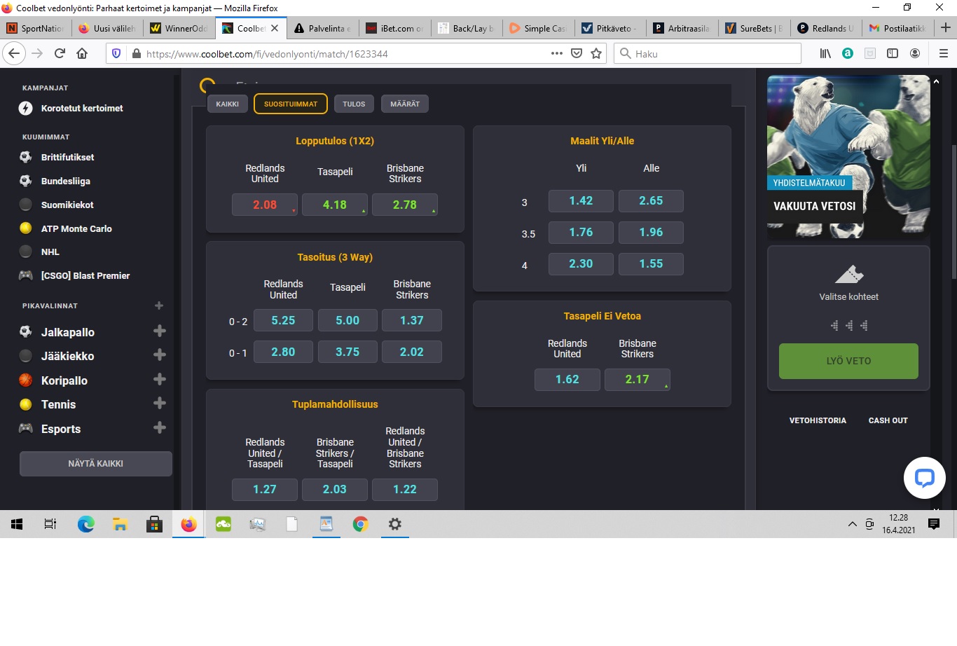 24.04.2021 12:32 <Muikkuz> LAK+0 2,12, X 4,15, ja 2 2,55 hieman päälle 100% palautus. Tietäis vain, mitä