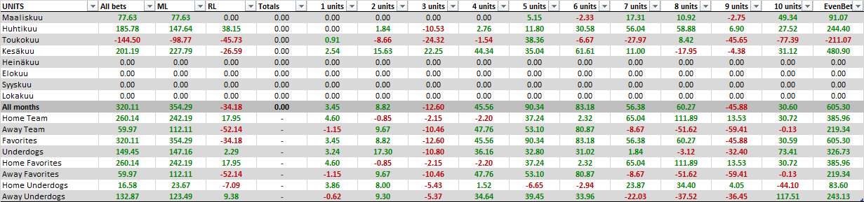 samsalonen kirjoitti:Pistetään väliaikatiedote omista vedoista jotka siis ovat handicapperin perusteella tehty. Erona aikaisempaan on se, että toukokuun puolessa välissä otin mukaan myös kohteet joiden OA on 1.01 - 1.05 aikaisemman >1.05 sijaan.