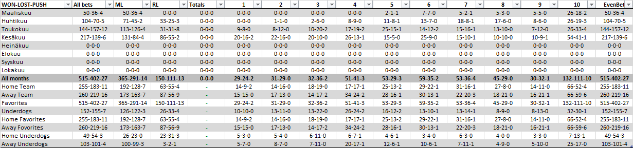 Tuoton tai tuottavuuden (tuottamattomuuden) kanssa oli toista vuotta putkeen ongelmia. Suomeksi sanottuna takkiin tuli jälleen huolella. Kuten aikaisemmin on tullut todettua, perustuu arviointimenetelmäni ottelun simulointiin. Pidän epätodennäköisenä, että simulointialgoritmi olisi huono tai että siitä löytyisi jokin isompi epäjohdonmukaisuus, joka rankasti vääristäisi tuloksia. Runline ja Totals vetojen suhteen löytyy muutama ongelmakohta liittyen ns. park faktoreihin, mutta ne eivät selitä heikkoa performanssia Moneyline vedoissa (pal% 99.8 %). Iso ongelma on todennäköisesti päivittäiseen vedonlyöntiin käytetty aika, tai pikemminkin sen puute. Päivittäiset rutiinit olen saanut todella hyvin automatisoitua. Datan keruu, taustalla tapahtuva laskenta ja datan luonti The Handicapperia varten tapahtuu ilman suurempaa vaivaa. Arvioidut-/reaaliaikaiset kokoonpanot, kerroinpäivitykset ja muu simulointia varten oleellinen informaatio päivittyy moitteettomasti. Myös itse simulointi on tarpeeksi nopeaa ja tulokset ovat johdonmukaisia. Ongelmat löytyvät kohteiden karsimisessa, kerroinmuutosten (markkinan) seuraamisessa, kokoonpanotietojen seuraamisessa ja sopivan panostusstrategian luonnissa. Näissä em. asioissa olisi (paljon) kehitettävää, jotta voitollisesta vedonlyönnistä voisi haaveilla.