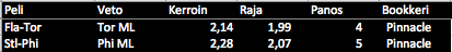 Ihan mukava kierros. Pikkasen on päivitetty konetta, jospa tuo Arizona-bugi (lähes 10% ero muihin täällä tipsaaviin) sen mukana korjaantuisi. Hieman tosin sylettää esim. viime yön matsi, kun viimeisessä erässä eivät tulleet edes tasoihin, vaikka olisivat ansainneet.