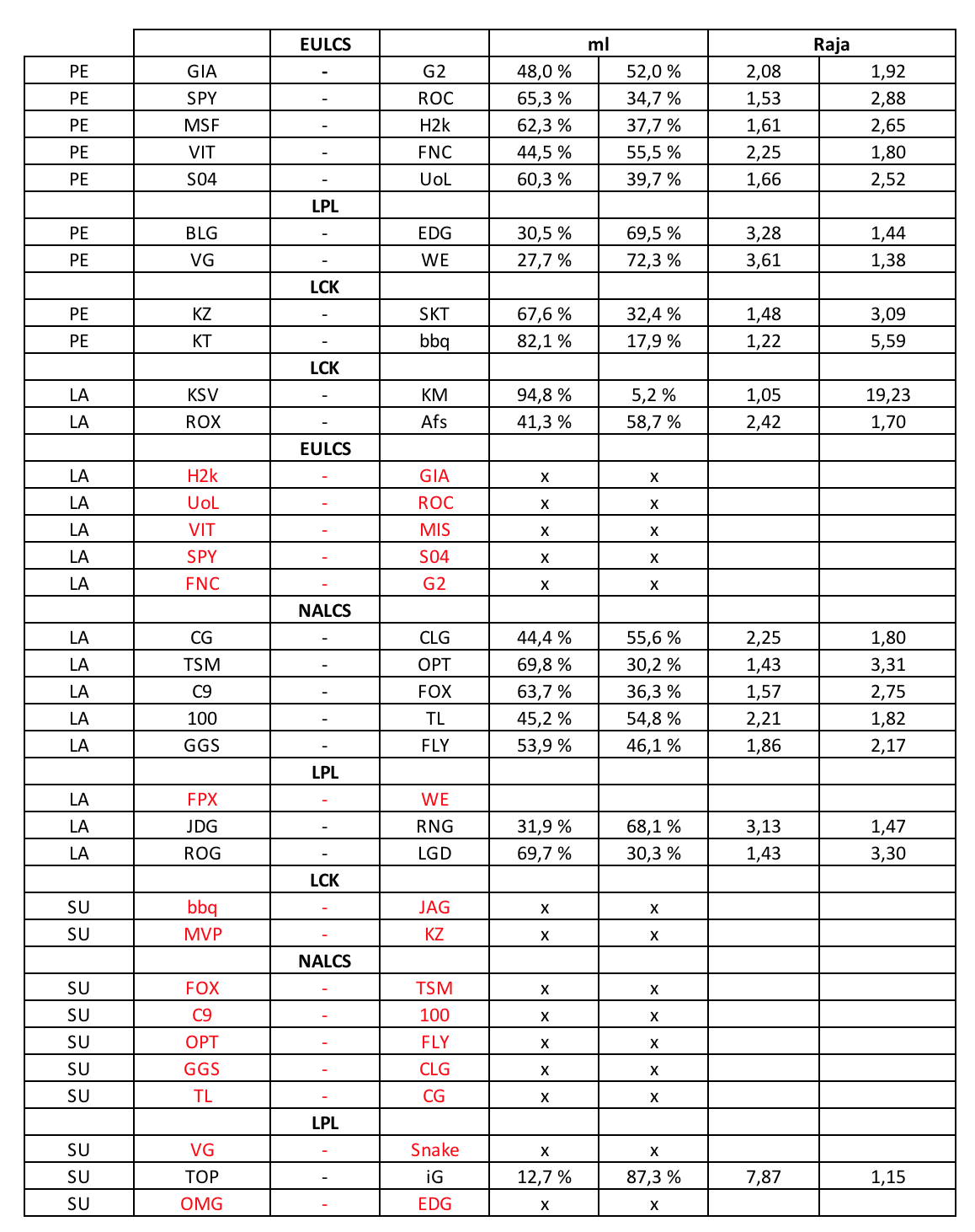 Vedonlyöntivihje: 26.1.2018 18:58 - LoL 2018 - Giants - G2 Esports - peliaika päättynytkohde Giants - G2 Esports veto Giants kerroin 2.950 (Veikkaus) panos 3 yks. raja 2.08 Vedonlyöntivihje: 26.1.2018 19:58 - LoL 2018 - Splyce - Roccat - peliaika päättynytkohde Splyce - Roccat veto Splyce kerroin 1.550 (Veikkaus) panos 0.5 yks. raja 1.53 Vedonlyöntivihje: 26.1.2018 20:58 - LoL 2018 - Misfits - H2k - peliaika päättynytkohde Misfits - H2k veto H2k kerroin 2.950 (Veikkaus) panos 1.4 yks. raja 2.65 Vedonlyöntivihje: 26.1.2018 21:58 - LoL 2018 - Vitality - Fnatic - peliaika päättynytkohde Vitality - Fnatic veto Vitality kerroin 2.850 (Veikkaus) panos 3 yks. raja 2.25 Pinnylle varmaan lähempänä parempia. Kaikki loput pelit ja arviot alla liitteessä. Itse en ehdi omien kiireiden vuoksi näitä nyt tänne vihjata ja pinnyn limitit vielä melkosen alhaiset. Punasella pelit, joiden arvio riippuu tänään/lauantaina pelattavista aiemmista otteluista.