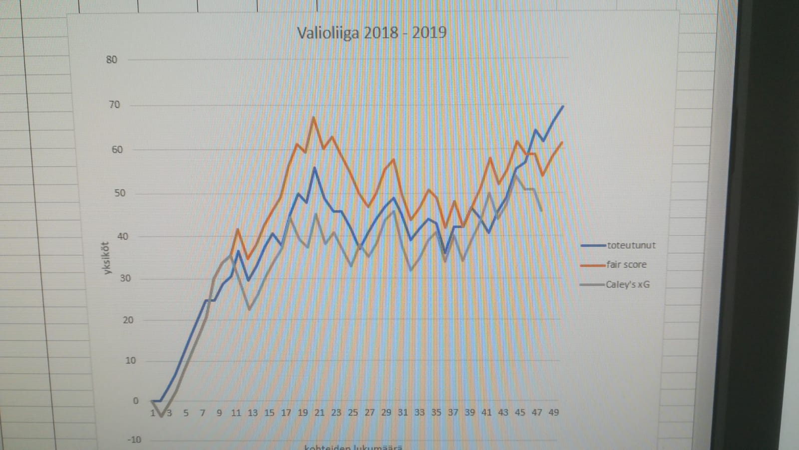 Saimme foorumiltakin tutun Jani Pellisen (https://twitter.com/JJJPellinen) koneelliset xG lukemat, joilla suoritettiin vastaavanlainen tuloksen mittaus kuin omilla lukemillamme (fair score).