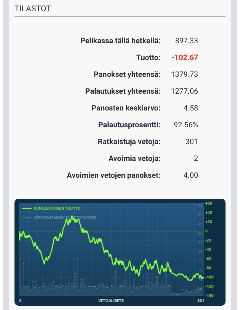 Vetohistoria päivitetty ajantasalle koko historian ajalta. 301 vetoa ja palautusprossa vaatimaton 92,56%. Otos toki hyvin pieni, joten eiköhän tuosta nousta. Tai sitten ei.
