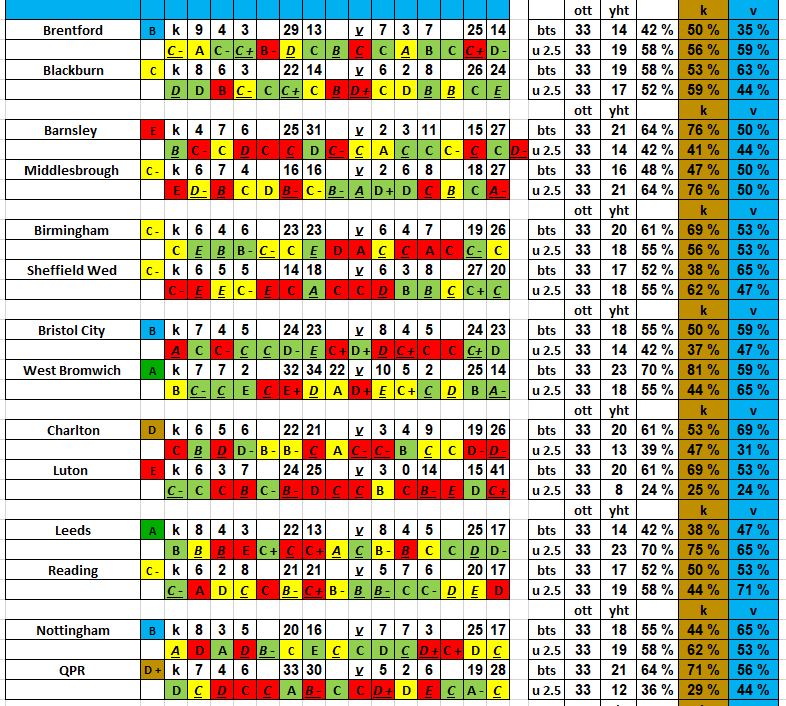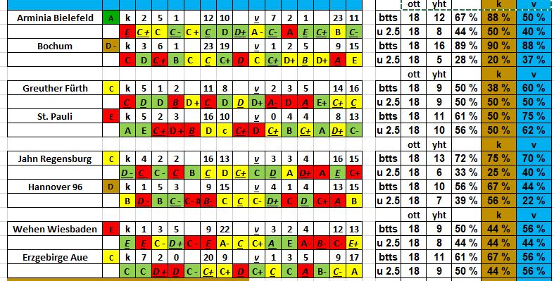 btts/u2.5 statseissa, pelatut ott, toteunut, yht %, koti% ja vieras%