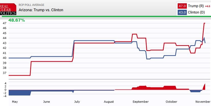 2016: Hillary 47.8 - Trump 43.8 (vapaita ääniä 8.4%)