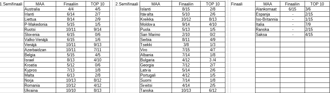 Todella yllättynyt olen jos molempien semien kahden ekan kategorian maat eivät mene jatkoon. Israelilla ohuet saumat ehkä finaaliin, mutta muilta osin myös alimman kategorian maiden jatkoonpääsy yllättäisi. Loppujen osalta enemmän tai vähemmän arpapeliä ja pitää nähdä stagingia että uskaltaa ennustella sen enempää.