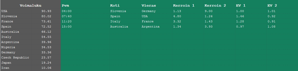 Olympia koripallo voimaluvut ja kerroinarviot.