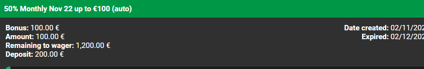 Ikinä ennen ei ole ollut ongelmia mutta eilen tein tuli tarjous 50% kuukausittais reload bonus ja talletin 200 euroa. Sain 100 euroa bonusta, laitoin vedon tennikseen koko rahalla josta 200 euroa hyväksyttiin automaattisesti ja 100 euroa manuaalisesti.
