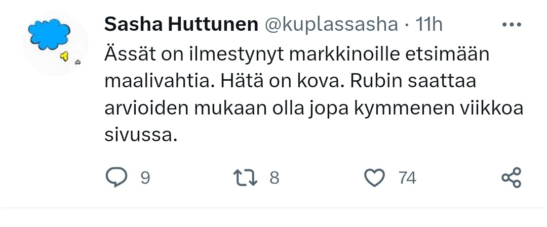 Olen koittanut viime ajat vältellä Ässien pelien vihjaamista punamustien lasieni vuoksi, jonka johdosta väkisinkin mennään suuntaan tai toiseen tunnepuolen kanssa. Joskus näitä olen vihjaillut, ja yleensä kyseessä ollut omaan silmääni selkeät kerroinasetteluvirheet. Pelaajavedoissa helpompi pitää pää kylmänä, ja keskittyä maalinteon kannalta oleellisiin asioihin.