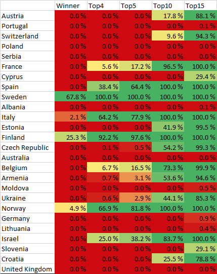 Israel ja Norja tän varmaan useimmiten voittaa, mutta kyl tää tuntuu ~15% mahdollisuudelta.