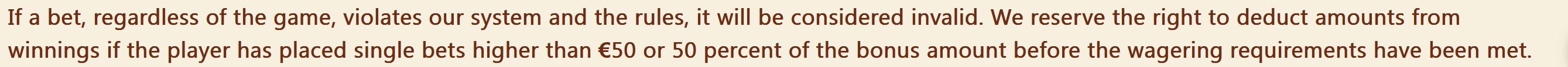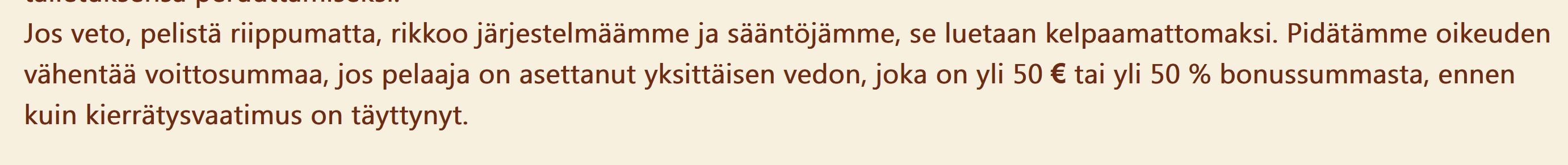 Eipä tossa oo mitään epäselvää. Jos pelaat bonuksella ja vedät yli 50€ panoksella tai panoksella joka on yli 50% bonussummasta niin lähtee bonari ja voitot kävelemään. Ei edes harvinainen sääntö. :peukku: