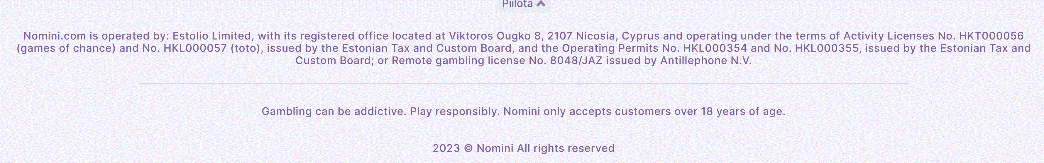 Katselin tässä ylikertoimen mainostamaa bookkeria Nominia. Minä ymmärtäisin tästä, että heillä olisi jokin viron lisenssi ja siten voitot verovapaita, mutta kuitenkin monessa paikassa sanotaan Curacaon lisenssi. Osaisiko joku selventää uuvatille? :D