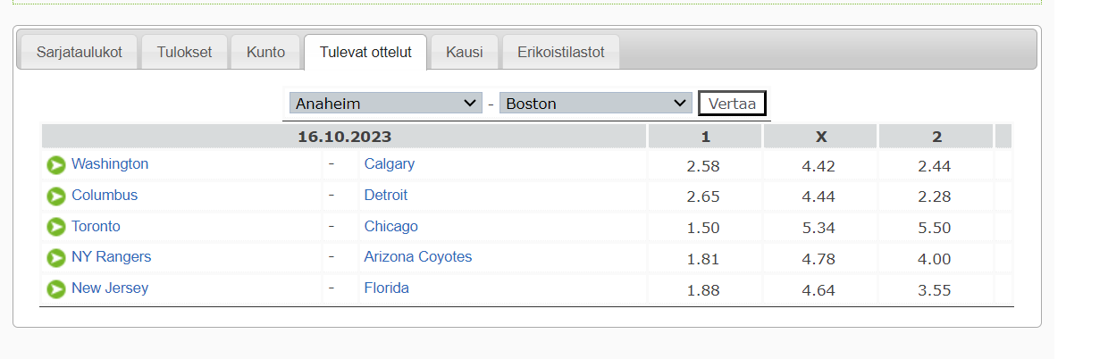 Tykkään käyttää Betexplorer sivua head to head vertailussa ja lähes pelkästään koskien NHL sarjaa. Ton sarjan osalta ärsyttä, että vertailussa on mukana vuosittain noi treenipelit, jotka haluaisin poistaa sieltä kokonaan, mutta en ole keksinyt, että miten ne sais pois? Ehkä niitä ei vaan saa ja hyväksyttävä tilanne. Jos jollain muu selkee sivu tohon vertailuun niin otat mielelläni vinkit vastaan kiitos. Tolla sivulla on hyvä, että selkeesti kausittain eritelty noi pelit.