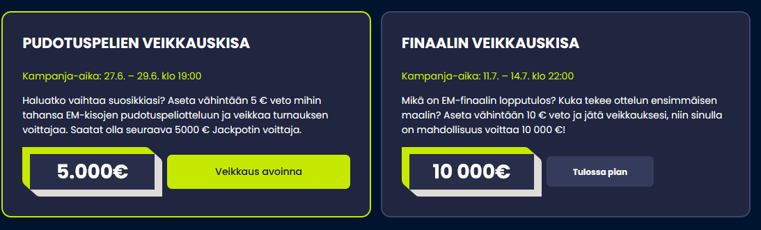 Sivustolla on meneillään myös EM-kisaveikkaus, jossa on mahdollisuus saada oikein vastaamalla osansa vielä jäljellä olevasta 15k€ palkintopotista.Ylikerroin.com kirjoitti: ↑25.06.2024, 17:57Vedonlyöntibonus: 100 % bonus 200 € asti