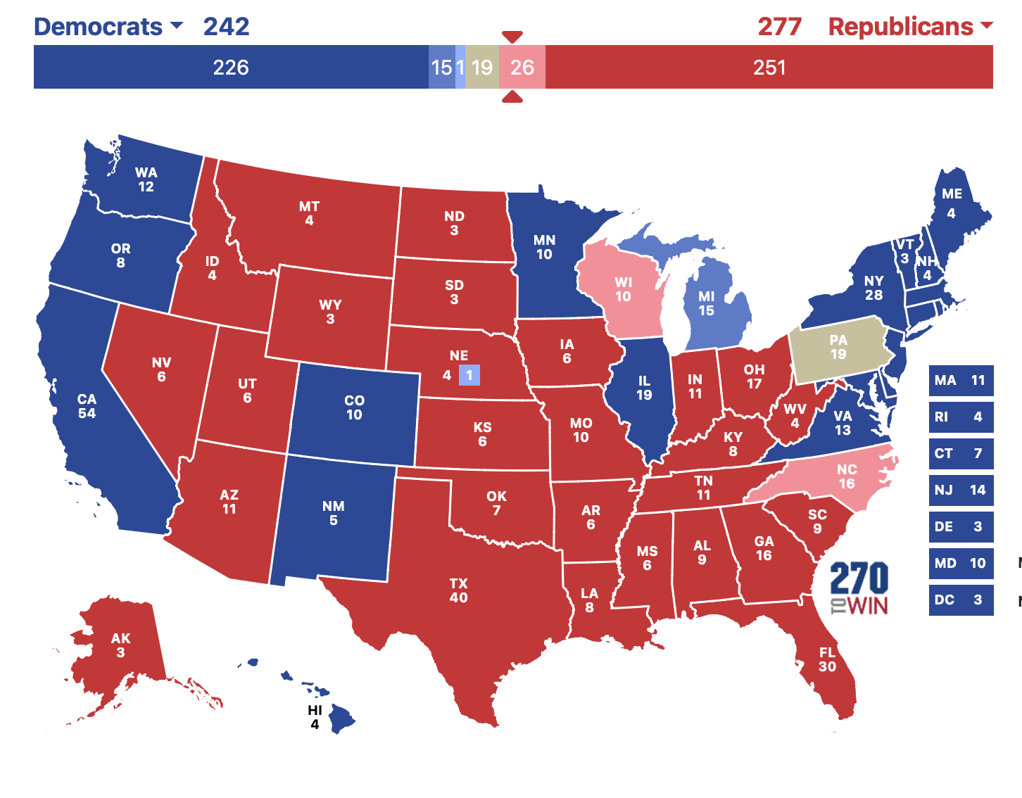 Kun 43 osavaltion tulokset jo enemmän tai vähemmän tiedetään, niin en kovin ihmeellisenä pitäisi jos Harrisin äänestäjät jäisivät ratkenneissa osavaltioissa kotiin ja turnout jäisi matalahkoksi. 2016 vaaleilta mutta päinvastoin tämä on minusta jo hetken tuntunut, ja löydän kyllä radikaalisti kertoimia suuremmat mahkut sille, että Harris voittaa vaalit täpärästi ja Trump popular voten.