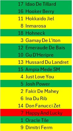 En ole vielä käynyt lähtöä sen tarkemmin läpi. San Moteur olisi tässä porukassa normaalisti suosikki, mutta se oli viimeksi vähän vaisu. Ganay De Banville/Bazire saanee medialta huomiota. Nuori Josh Power on ehkä kiinnostavin hevonen, näkee suuntaviivoja kuinka tuo ikäluokka riittää näissä karkeloissa. Yhteensä 7 hevosen taustat ovat antaneet hevoselleen vihreän pallukan eli monella on omastaan odotuksia.