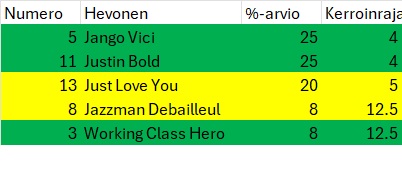 Just Love You : Juoksi viimeksi keulassa, missä sai matkalla pientä painetta. Piti loppusuoralla suuremmin hätistelemättä kolmanneksi. Parantanee tähän, mutta ihan kärkisijoitus yllättäisi.