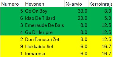 Prix Du Bourbonnais(klo 16.15) - aikavertailu. Hevoset värikoodattu valmentajien odotusten mukaan eli vihreä paras, punainen huonoin.