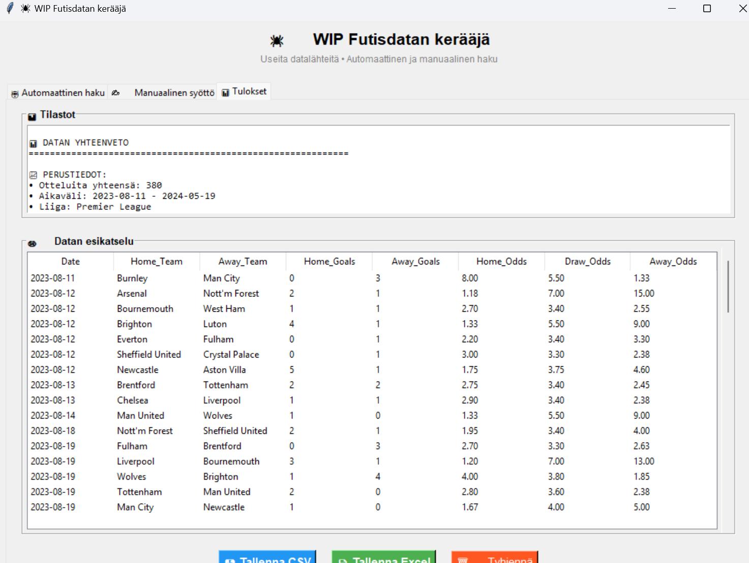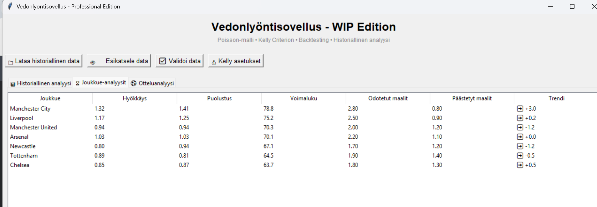 Olen kehittelemässä vedonlyönnin avuksi sovellusta ja ajattelin hieman kysellä millaisia ominaisuuksia teidän mielestänne tähän pitäisi rakennella? Data haetaan automaattisesti ilmaisesta https://www.football-data.co.uk/data.php sekä osa datasta luodaan manuaalisesti xls tiedostoon jota sovellus lukee etc.