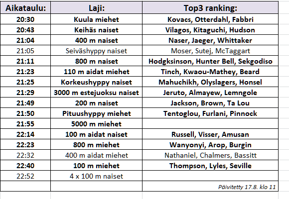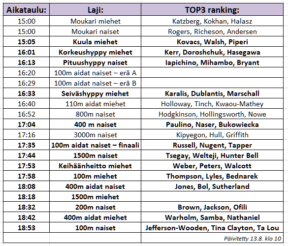 17.06.2025 14:06 <Tenkrat> Raitanen ei juokse tänään. Miesten kiekossa Ståhl menee Pruferin edelle