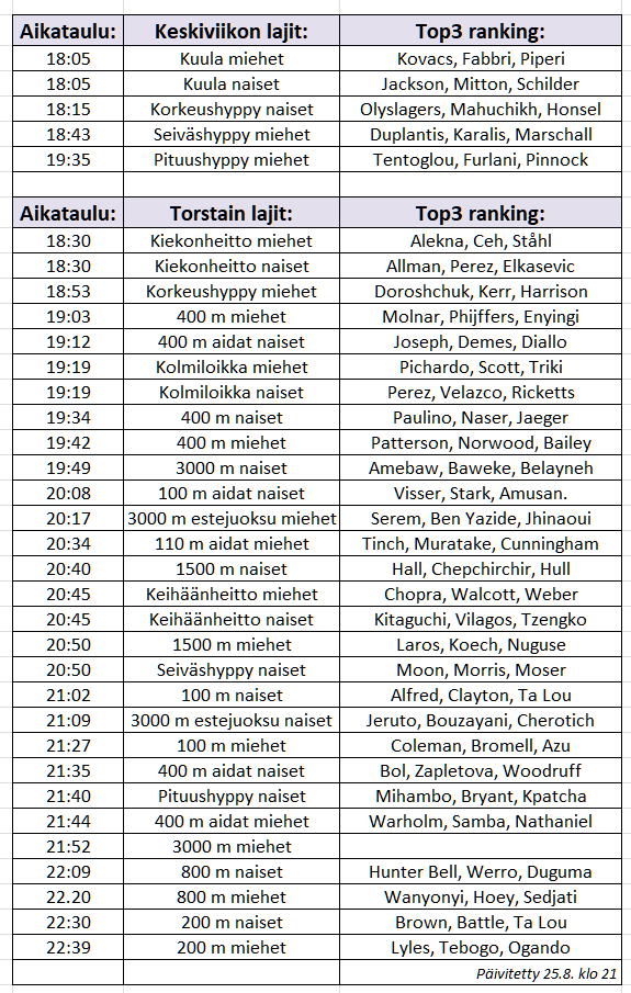 26.08.2025 12:48 <Tenkrat> Torstaina sää näyttää olevan karmea. Naisten seiväshyppy on ainakin jo siirretty