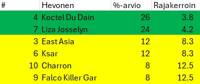 Charron jäi pois, mikä helpottaa pelivalintaa, joka on Koctel Du Dainin voittaja/sija. Eivätköhän ko pelimuodot maksa lopussakin liikaa.