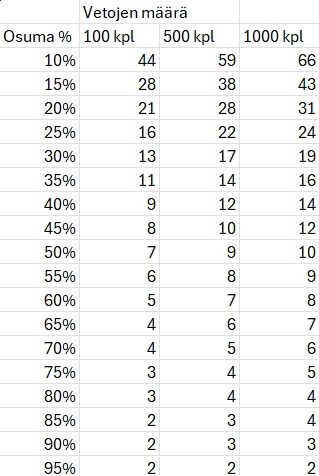 Jos kysytään kummassa lajissa/sarjassa jää vihjeilläni todennäköisemmin tulevaisuudessa plussalle, niin vastaus on ehdottomasti Ranskan ravit. Ranskassa raviurheilu vain on niin kilpailullista, että suosikkienkin kertoimet ovat melko korkeita verrattuna esim. Suomeen, jolloin pelaaja altistaa itsensä suuremmalle hajonnalle/varianssille. Läheskään aina suosikki ei edes ole lähdön edullisin pelivalinta, joten tappioputket voivat kestää. Laitan viestin loppuun taulukon, minkä avulla voi hahmotella kuinka pitkiksi tappioputket voivat muodostua eri todennäköisyyksillä osuvissa vedoissa. Esim. 20% osuvilla vedoilla pisin tappioputki 1000 vedon sarjassa on 31 vetoa. Jatkaisitko peesaamista esim. 15 peräkkäisen hudin jälkeen? Luulen, että kovin moni ei jatkaisi, vaikka tuollainen tappioputki kuuluu hevosvedonlyönnissä vähän kuin asiaan. 50%-50% point spreadeilla ei 15 hudin putkea oikein taas saa edes maksimi huonoilla tuureilla aikaiseksi.
