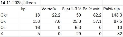 Pieni katsaus lämmityshavaintoihin tähän (13.11. 2025) mennessä. Voittajapeli on positiivisissa lämmityksissä lyhyessä otoksessa miinuksella (pelin laskennallinen pal% 85%), mutta sijapeli reilusti plussalla. Uskon, että nuo luvut lähestyvät selvästi toisiaan jatkossa ja ainakin kuvittelen, että lämmityshavainnoista on saatavissa jatkossa etua myös voittajapelissä.