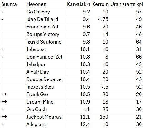 Pientä potentiaalisten Elitloppet - hevosten vertailua. Karvalakkiratingit 2100m+ matkoilta, koska ranskalaisilla ei oikein ole mailin suorituksia. Itse pelasin 0,5/10 panoksella tässä vaiheessa Borups Victoryn (14x) ja jättipottiyllättäjän Jackpot Mearasin (150x). Pitää muistaa, että panoksia ei palauteta, jos hevonen ei osallistu.