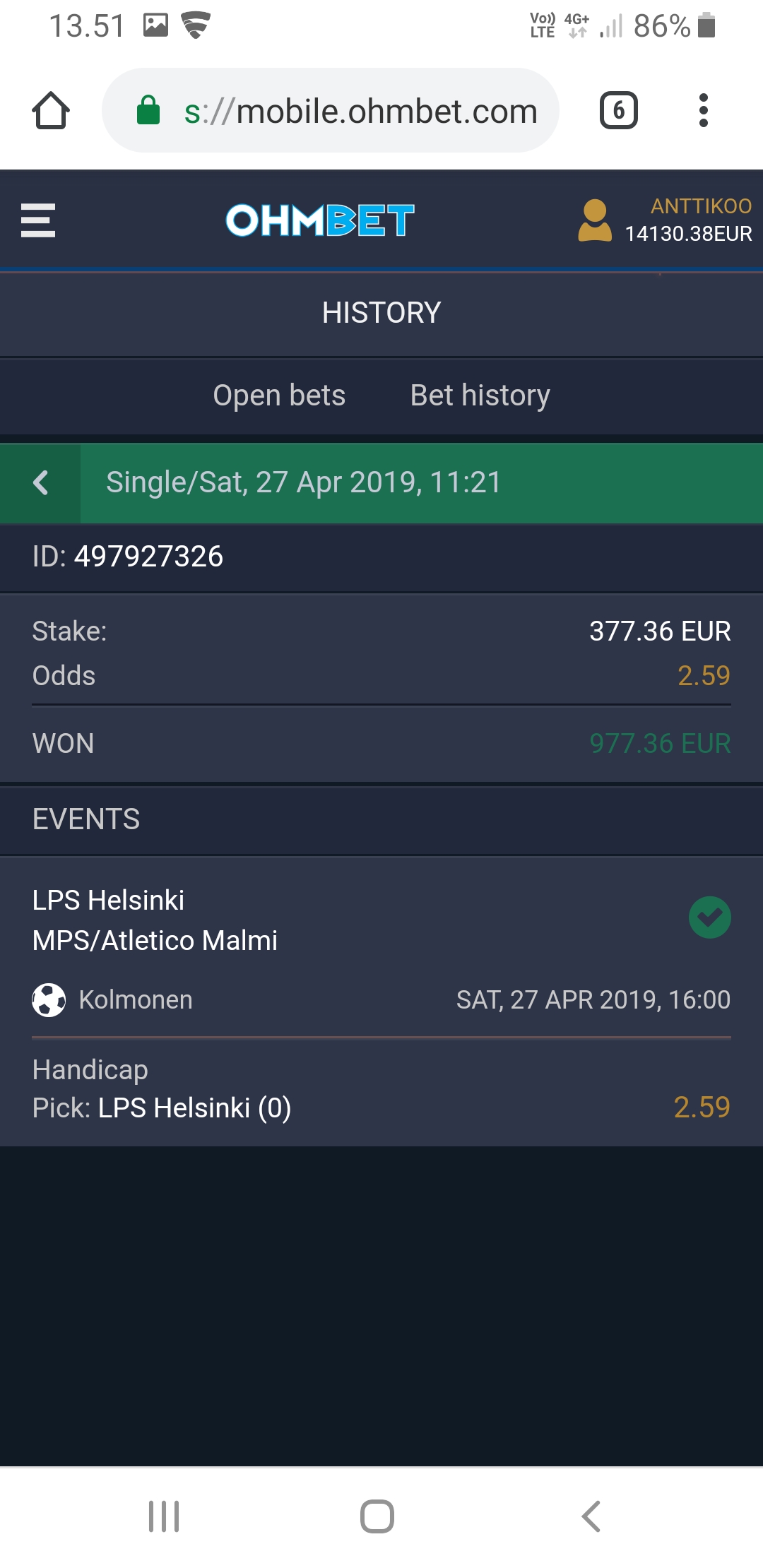 Avasin tilin 27.4 ottaakseni vetoja Suomen Kolmosen matseihin (TuPS-PK35, LPS-MPS Atletico Malmi, Rollon Pojat - Rovaniemi united. Päädyin tallettamaan kolmessa osassa 8000 euroa ja otin vetoja 15kpl yhteensä 8721 eurolla. En ottanut vastaan bonusta. Ohmbet määrittää maksimipanokset siten, että pre vetoihin sai nettona voittaa 600e/pelimuoto ja livessä 800e/pelimuoto. Otin siis useita eri linjoja/vetomuotoja samoihin peleihin lisätäkseni kokonaispanosta. Viimeisenä mainitun pelin vedot myin "cash out" näppäimen kautta, täten siis vetojen määrä ylitti talletuksien määrän kun laitoin nekin rahat samantien kiertämään. Olen ammattivedonlyöjä, eivätkä nuo summat ole minulle mitenkään tavanomaisesta poikkeavia. Itseasiassa olisin halunnut lyödä huomattavasti suuremmalla, sen verran pielessä kertoimet olivat, enkä mihinkään muuallekaan mainittuihin peleihin vetoja saanut.