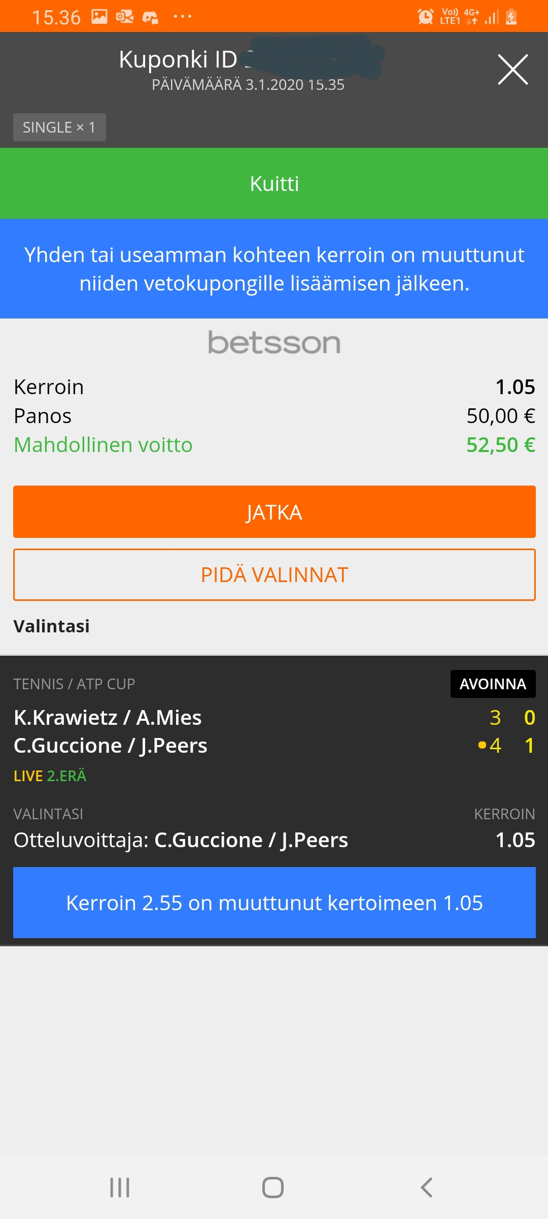Löin siis vedon liitteen kuvien mukaisesti. Betsson antoi pelille kertoimet 2.55 mutta nämä tipahtivat vedon vahvistamisen aikana (eli n. 2-3sekuntia) 1.05:een mikä on tenniksessä ihan silkka mahottomuus. Ilmoitin kun kerrankin sain napattua tapahtuneesta screenshotin betssonin asiakaspalveluun jossa vastaus oli tyly että järjestelmässä ei ole mitään ongelmaa ja tämä on silkkaa pelistä johtuvaa ''On harmillista että näin on päässyt käymään mutta kuten chatissakin juttelimme, livevedonlyönnissä ja etenkin tenniksessä tilanteet muuttuvat äärimmäisen nopeasti jolloin kertoimia joudutaan päivittämään tiuhaan tahtiin.''