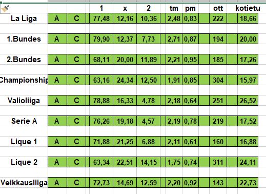 Nyt on laskettuna 2 000->; Valioliiga, Championship, 1. ja 2. Bundes, La Liga, Serie A, 1. ja 2. Lique, Veikkausliiga, Ykkönen(2005->), Tippeliiga, Allsvenskan, Superettan ja SM-liiga, vielä kun osaisi niitä soveltaa....