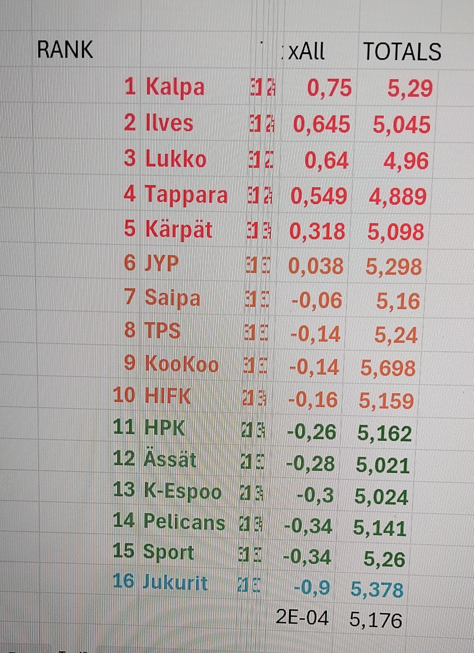 2. Ilves..........8,5 ........ 8+ ...... 9+ ....... 8,5